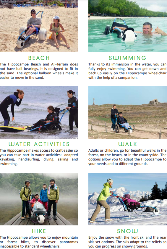 Discover the features of the Vipamat Hippocampe Beach and All-Terrain wheelchair! Made in France, the special needs wheelchair Hippocampe is composed of stainless materials. The tube frame is made of treated seawater aluminum and is covered by a comfortable colored cladding which avoids sun and cold burns. The axles and half-axles of wheels are made of stainless steel. Dual wheels are without ball-bearing, avoiding the jamming by oxidization. The outer rim is covered by a grip that serves as handrail for users.The seat is composed of closed-cell foam for water resistance, with a thickness of 3 cm that it enables to be comfortable and quick-drying. The seat fabric is fireproof treated as required by French law. A light wheelchair and transportable! The beach wheels, all-terrain wheel, ski options and push bar can be easily taken off and installed thanks to its clip system. The light wheelchair Hippocampe can be transported in a wheelchair bag to put it in a car or travelling by plane (in option).