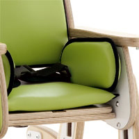 Two-point lap belt and side pads for lateral stability.
