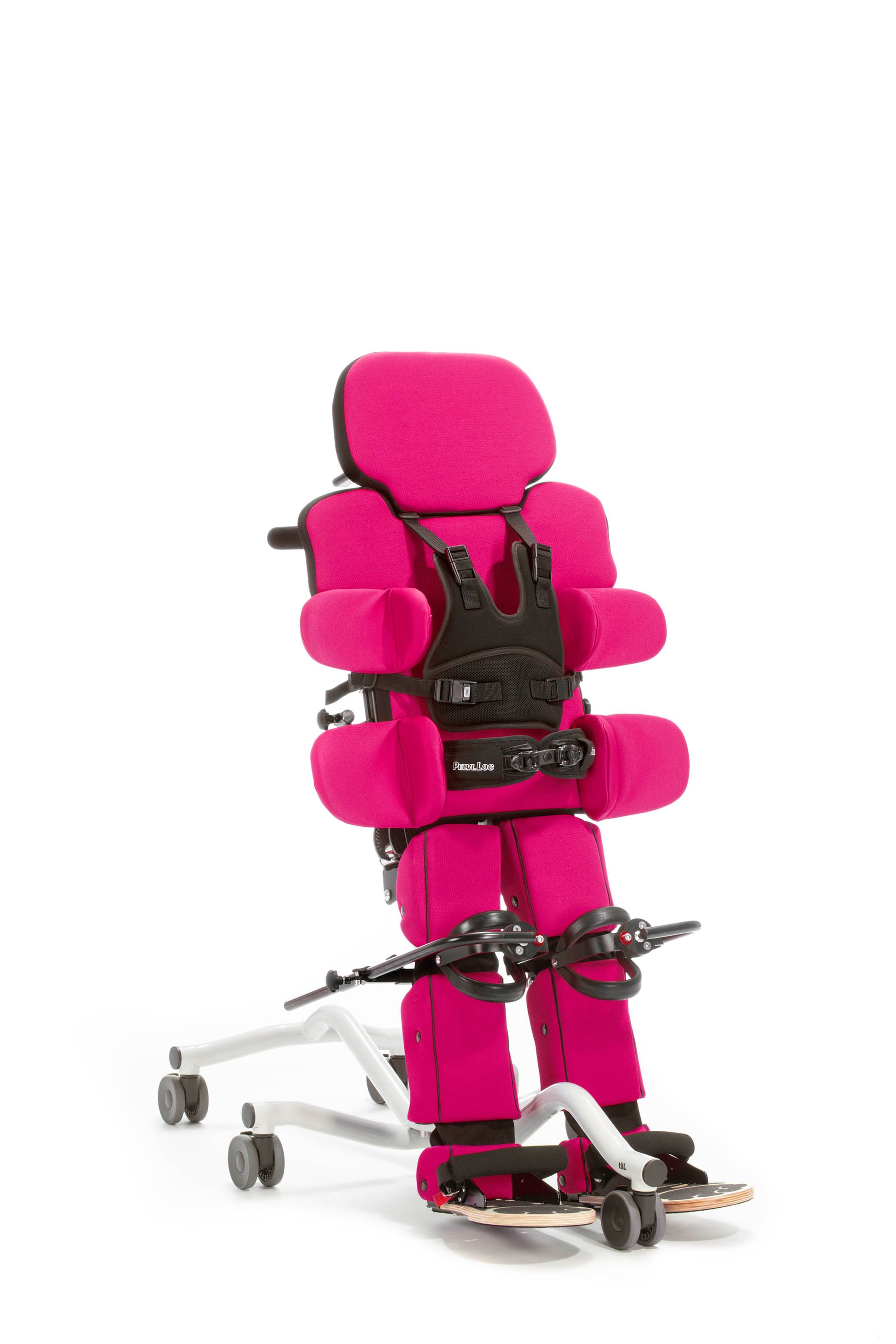 Standing is important for the development of the bodys structures: weight bearing stimulates bone growth and density. In addition, regular standing has a positive influence on other health and well-being factors such as digestion and breathing. Specific muscles are challenged and developed when using standing frames including those of the torso, back, legs and shoulders region. As the inclination is adjusted the childs perception of their surroundings changes too, they can see and react to their surroundings much better. That is why till. is not only a good support during the therapy session. But also in everyday life.